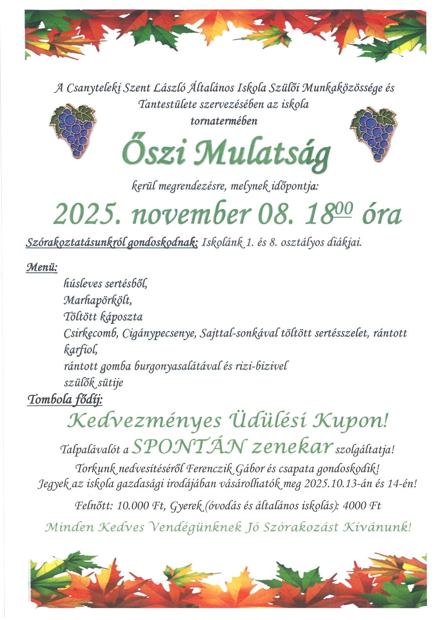 A Csanyteleki Szent László Általános Iskola Szülői Munkaközössége és tantestülete szeretettel vár mindenkit az iskola tornatermében megrendezésre kerülő Őszi Mulatságra, melynek időpontja: